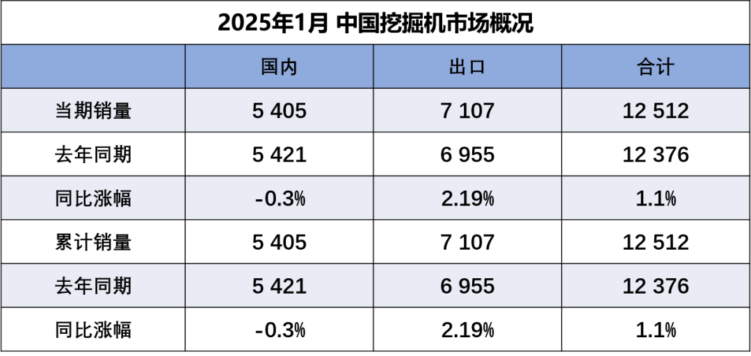 據(jù)中國工程機械工業(yè)協(xié)會對挖掘機主要制造企業(yè)統(tǒng)計,2025年1月銷售各類挖掘機12512臺,同比增長1.1%。其中國內(nèi)銷量5405臺,同比下降0.3%;出口量7107臺,同比增長2.19%。2025年1月…...